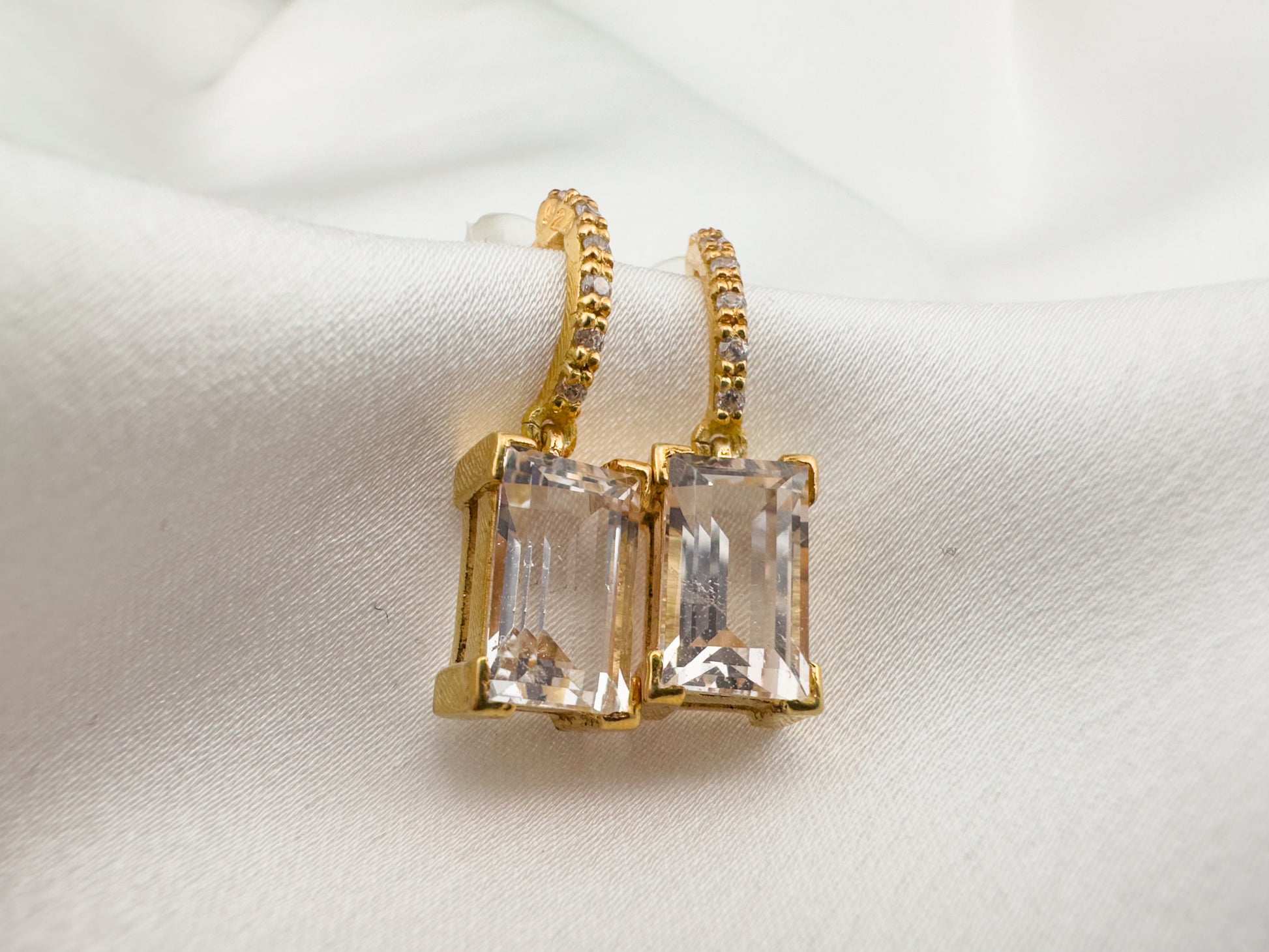Indulge in the captivating allure of our Natural White Topaz dangle earrings, showcasing remarkable craftsmanship and adorned with stunning zirconia embellishments. The exquisite baguette-cut White Topaz gems radiate an aura of elegance, distinguished by their exceptional clarity, pristine brilliance, and captivating white hue, exuding sophistication and grace.
